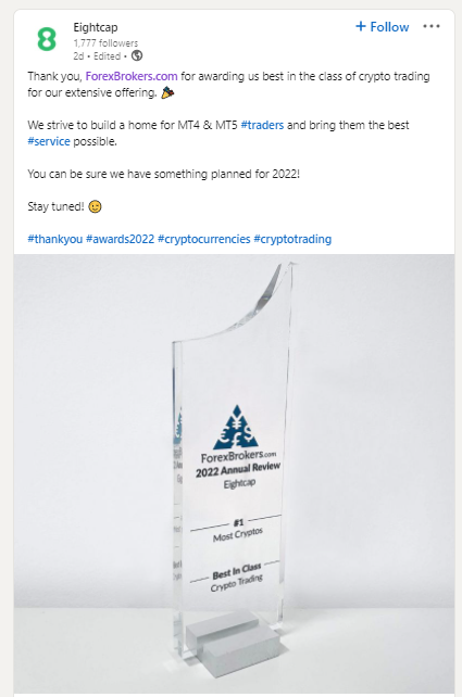 - EightCap - "Thank you, ForexBrokers.com for awarding us best in class..." tweet